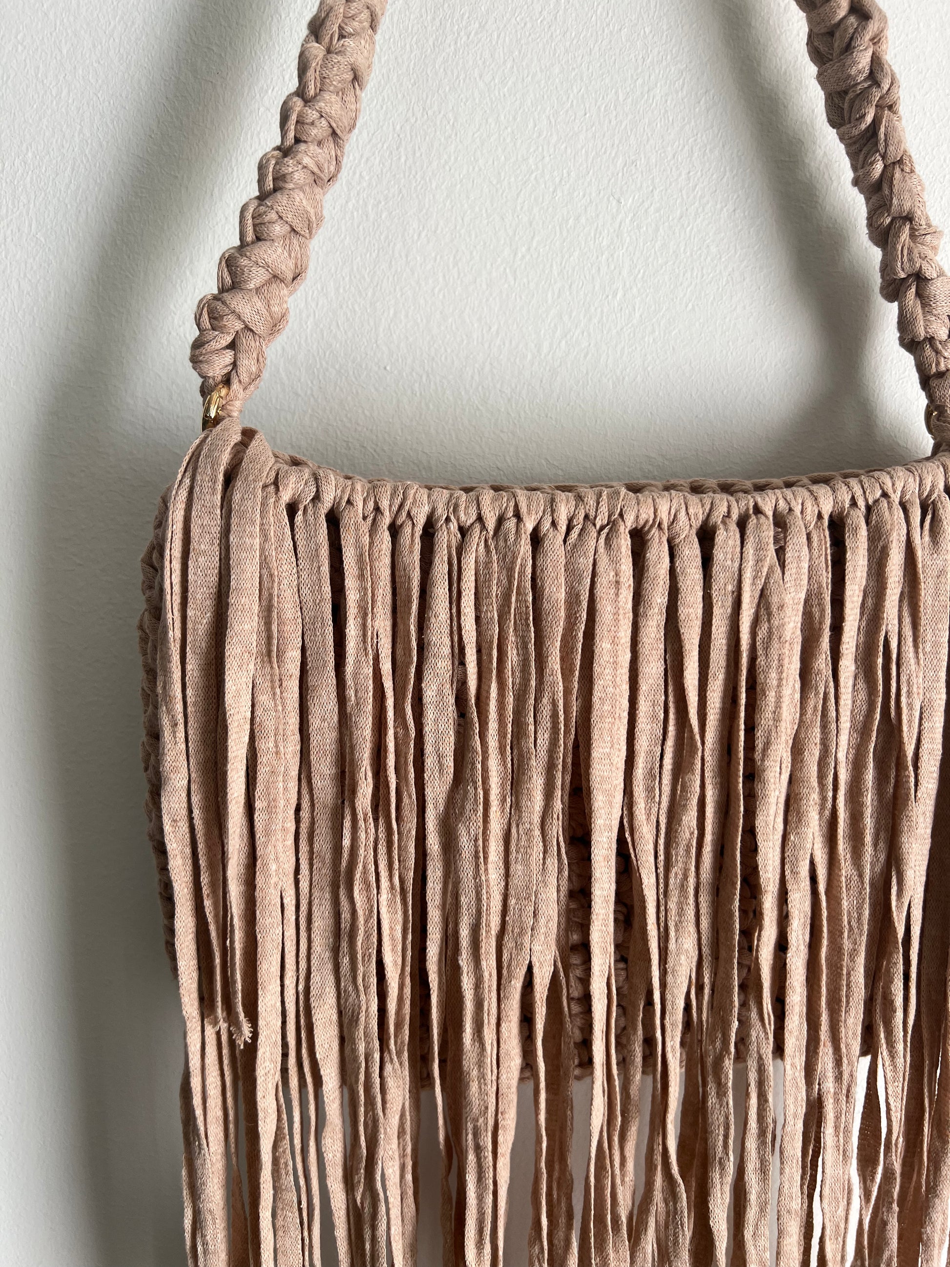 Beige clutch bag with long tassels, zip and crocheted crossbody strap